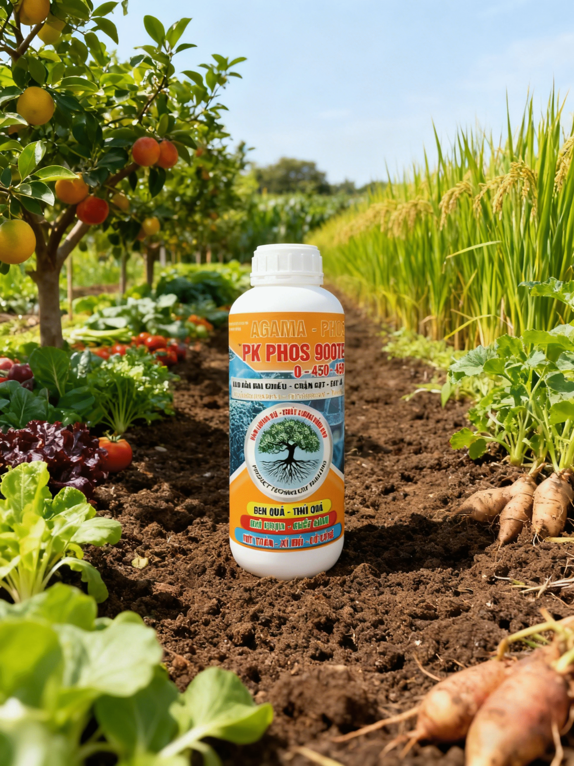 - PK PHOS 900TE là sự kế hợp giữa Phosphorus, Potassium hàm lượng cao và các vi lượng dang chelate, có đặc tính lưu dẫn 2 chiều giúp cây hấp thụ tốt qua lá, thân và vùng rễ.